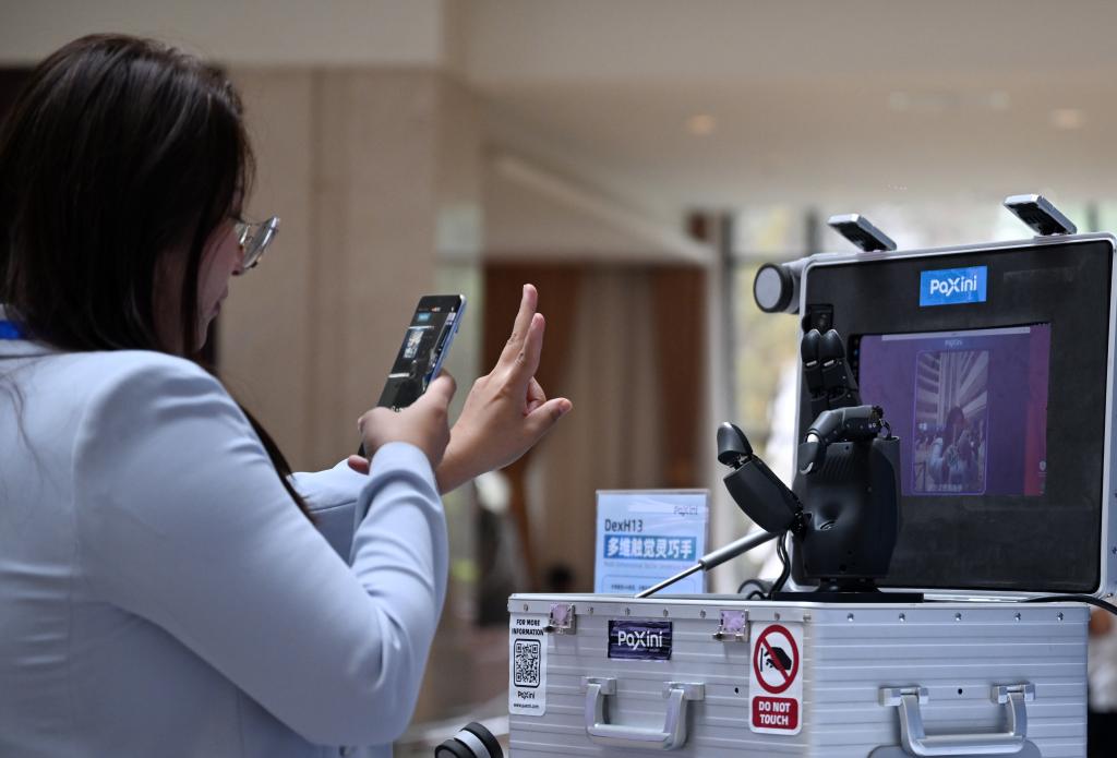 9月24日,与会嘉宾在2025中国民营企业投融资洽谈会开幕式会场外参观一款“灵巧手”。新华社记者赵子硕 摄