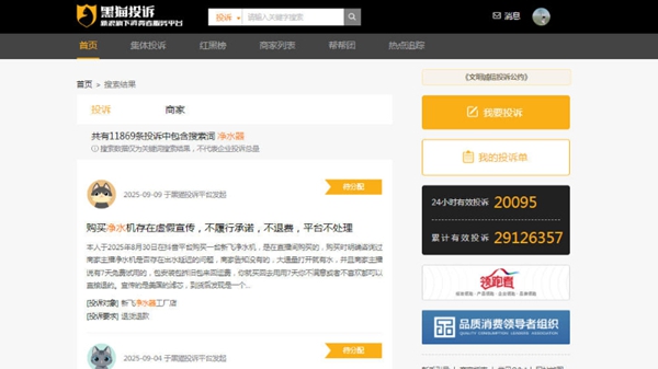然而,在市场繁荣的背后,行业乱象也逐渐浮出水面。记者在黑猫投诉平台上查询到,关于净水器的投诉量高达11869条。消费者投诉内容主要集中在滤芯使用寿命标注模糊、功能效果虚假宣传、实物与宣传描述不符,以及针对老年群体的误导性推销等方面。
