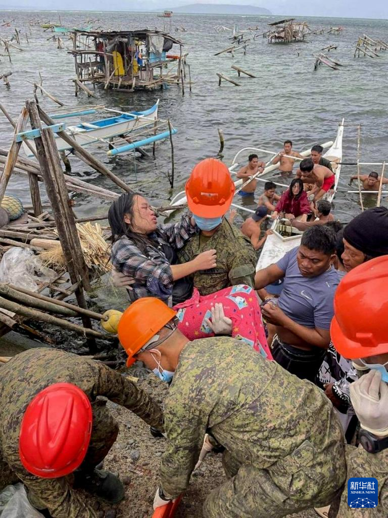 9月26日,在菲律宾萨马省,救援人员对受困的乘客实施救援。新华社发(菲律宾军方供图)