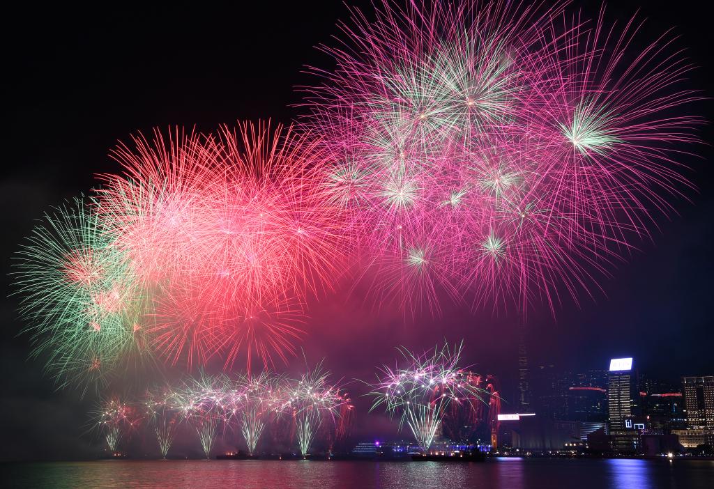 碧空万里如洗,风展红旗如画。1日的香港,五星红旗与紫荆花区旗飘扬,丰富多彩的庆祝活动如火如荼。以“维港烟花 闪耀中华”为主题的国庆烟花汇演如约而至。