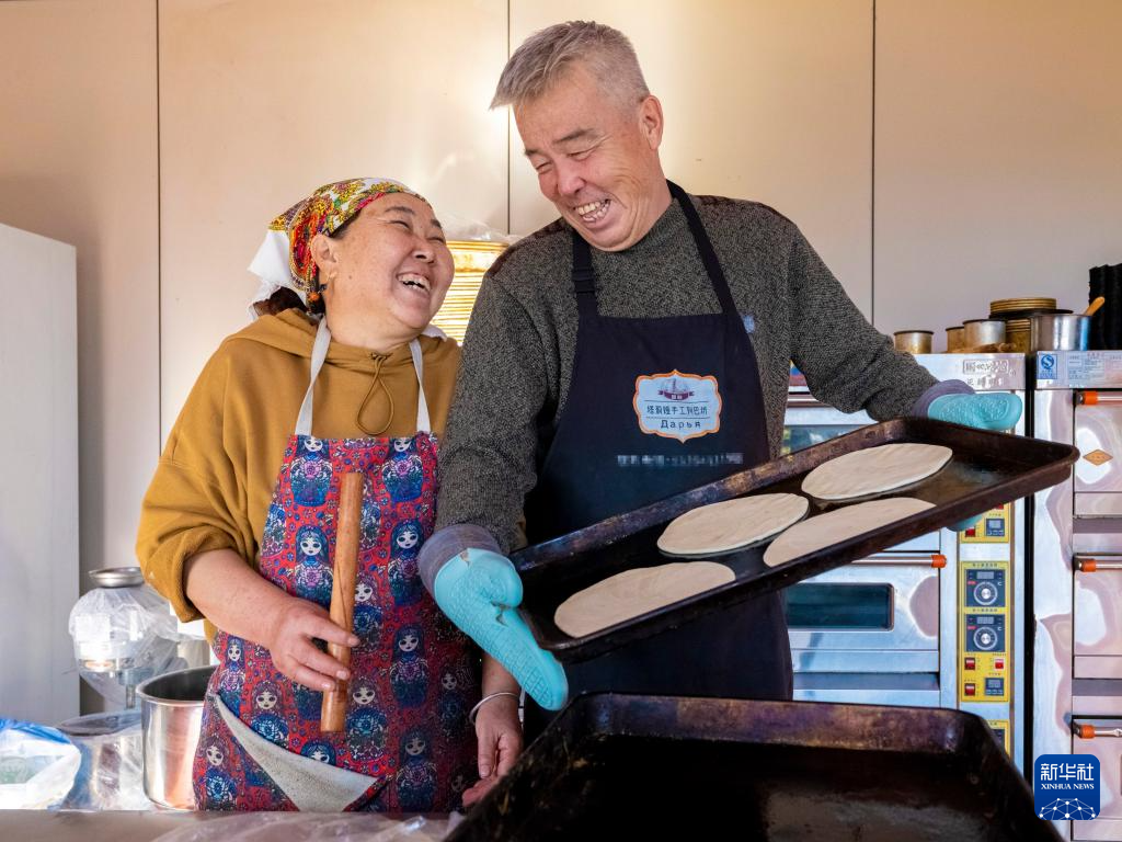 9月17日,在内蒙古呼伦贝尔市额尔古纳市恩和俄罗斯族民族乡恩和村,一名蒙古族妇女(左)与她的俄罗斯族丈夫共同制作传统的俄罗斯族列巴。
