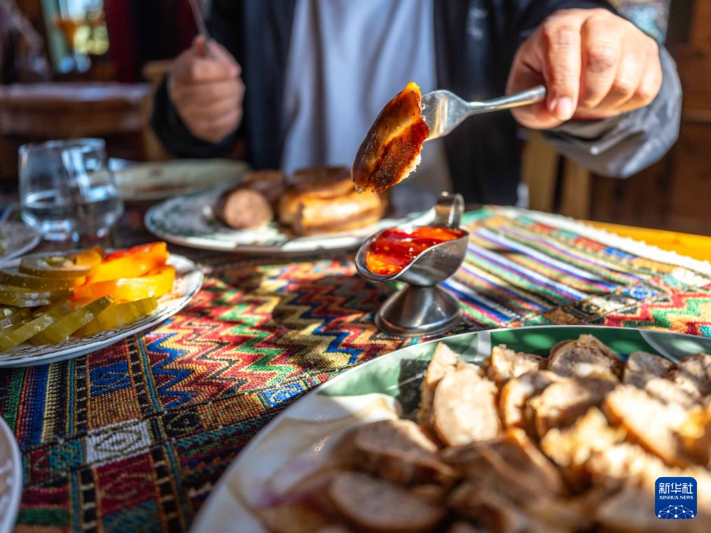 9月18日,在内蒙古呼伦贝尔市额尔古纳市恩和俄罗斯族民族乡恩和村,游客享用俄罗斯族传统美食。