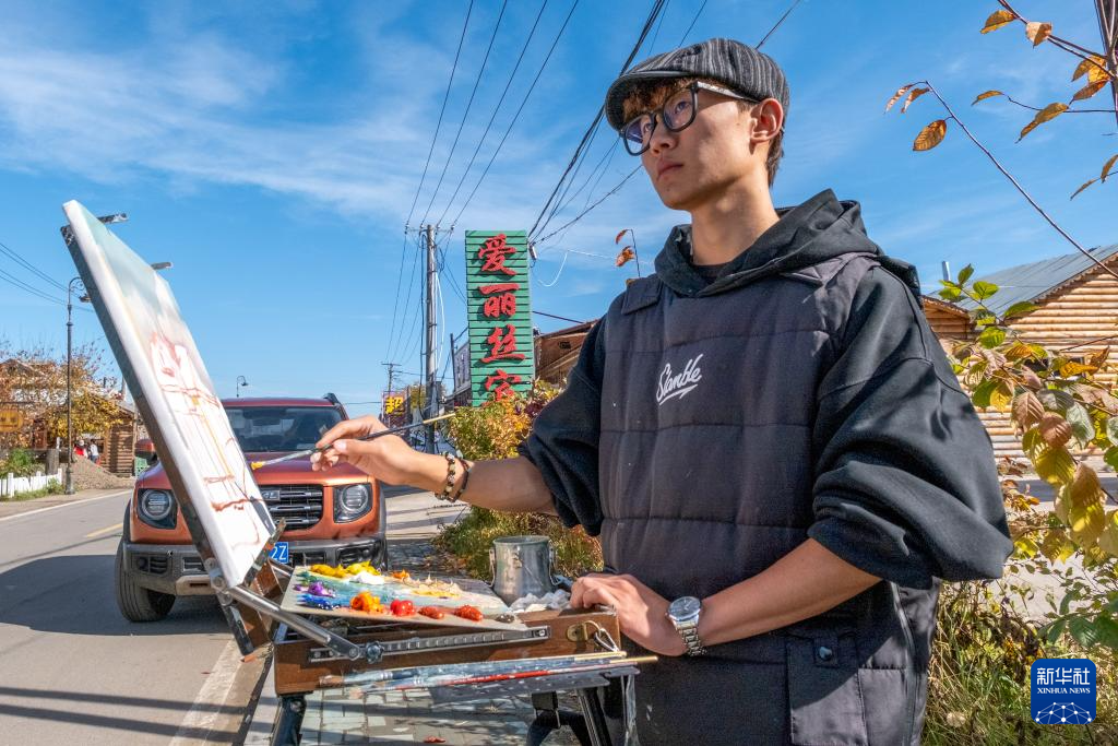 9月26日,一名学生在内蒙古呼伦贝尔市额尔古纳市恩和俄罗斯族民族乡恩和村写生。