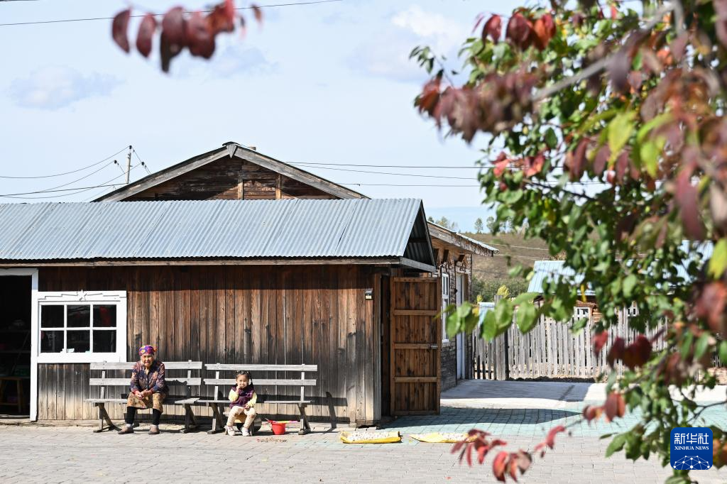 9月18日,在内蒙古呼伦贝尔市额尔古纳市恩和俄罗斯族民族乡恩和村,当地居民在一座木刻楞外休息。
