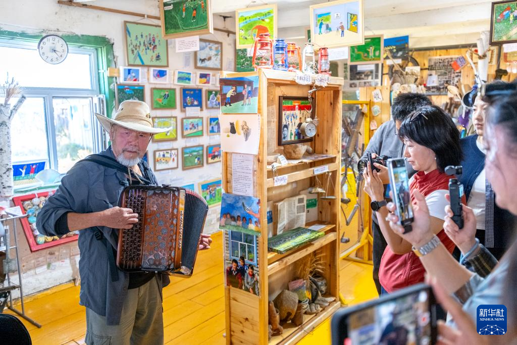 9月26日,在内蒙古呼伦贝尔市额尔古纳市恩和俄罗斯族民族乡恩和村,黄老头为游客们演奏手风琴。黄老头本名黄焱红,曾是一名旅游记者,退休后开了“黄老头博物馆”,宣介当地文化。