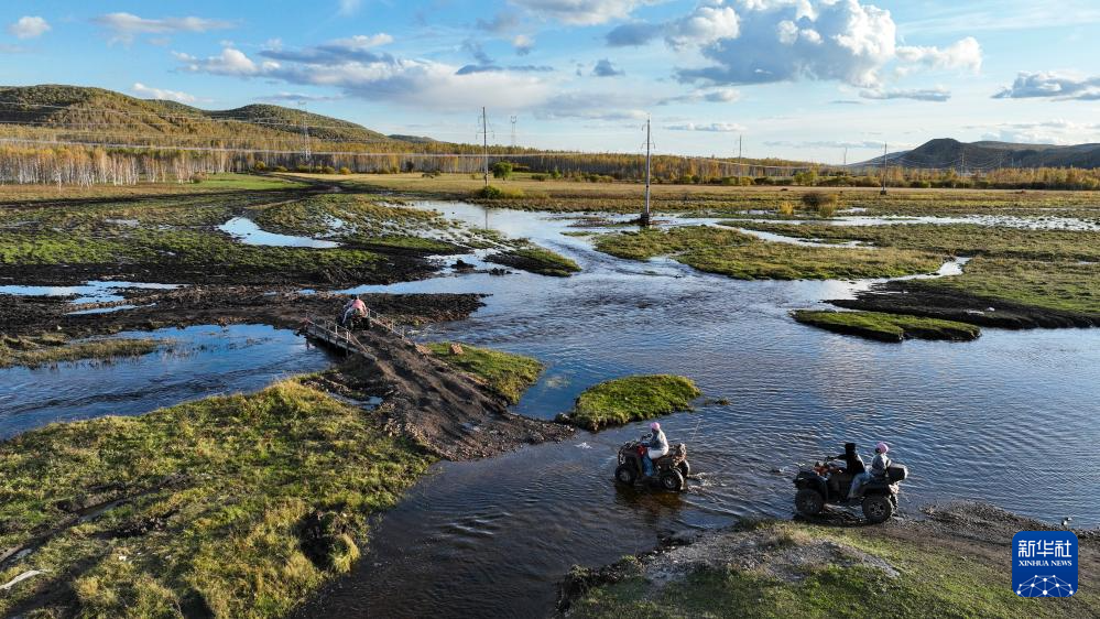 9月17日,在内蒙古呼伦贝尔市额尔古纳市恩和俄罗斯族民族乡恩和村,游客驾驶越野摩托游玩(无人机照片)。