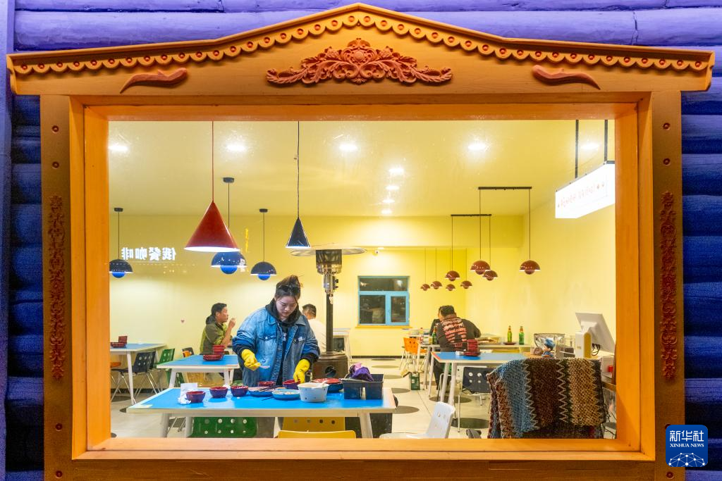 9月25日,在内蒙古呼伦贝尔市额尔古纳市恩和俄罗斯族民族乡恩和村,人们在一家木刻楞风格的餐馆进餐。