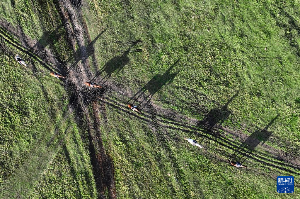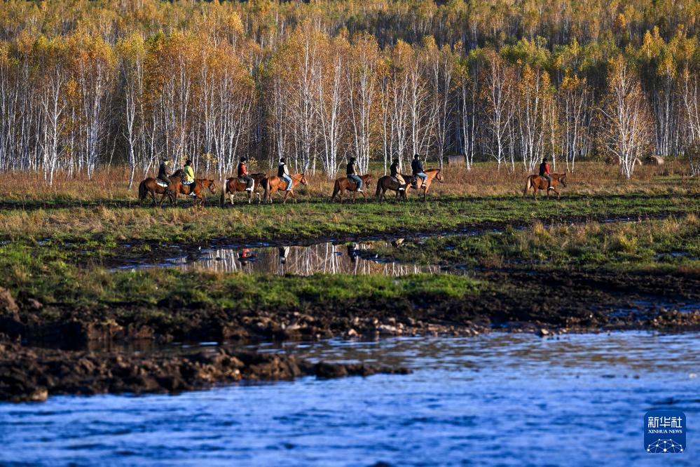 9月17日,在内蒙古呼伦贝尔市额尔古纳市恩和俄罗斯族民族乡恩和村,游客在骑马(无人机照片)。