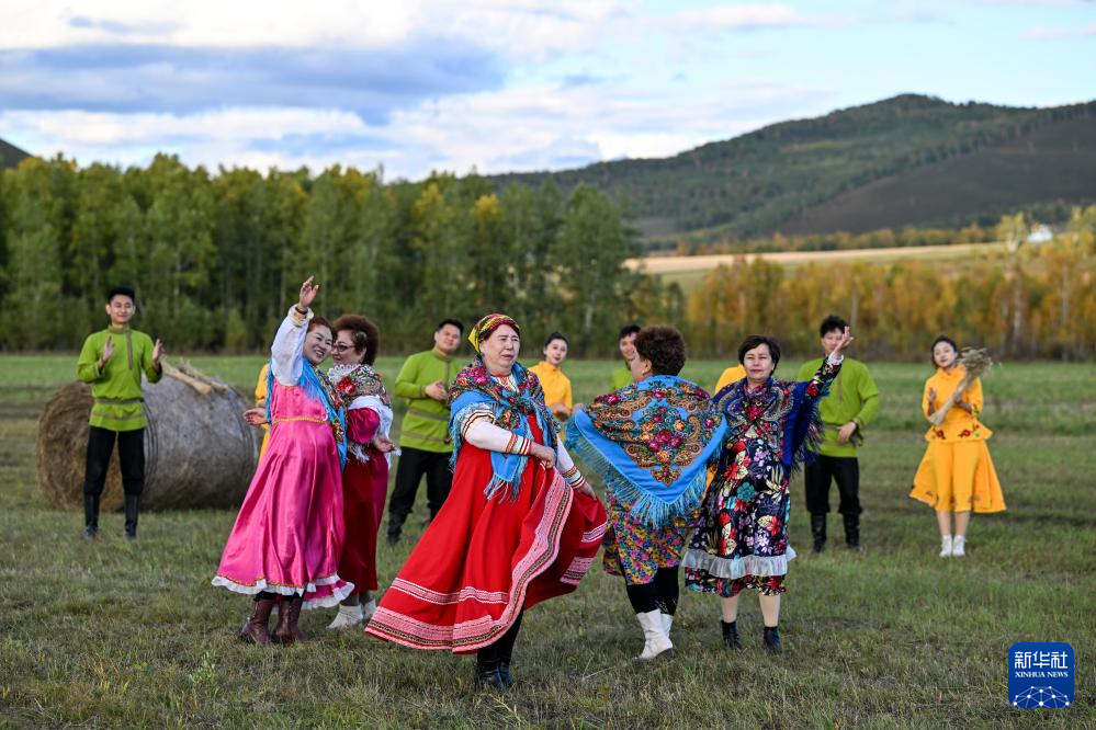 9月15日,在内蒙古呼伦贝尔市额尔古纳市恩和俄罗斯族民族乡,人们参加丰收节活动时跳舞。