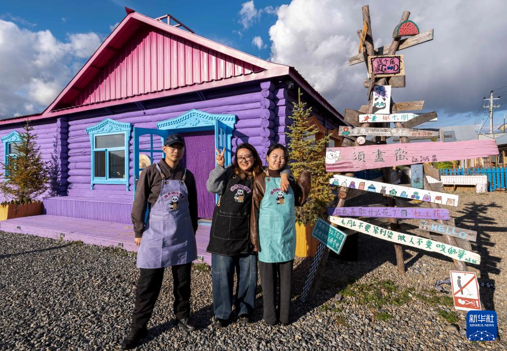 9月17日,在内蒙古呼伦贝尔市额尔古纳市恩和俄罗斯族民族乡恩和村,来自重庆的年轻人在他们开的川菜馆前合影。