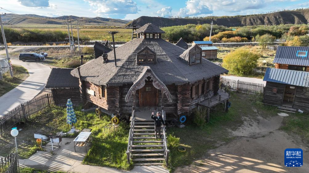 9月17日在内蒙古呼伦贝尔市额尔古纳市恩和俄罗斯族民族乡恩和村拍摄的一处木刻楞酒吧(无人机照片)。