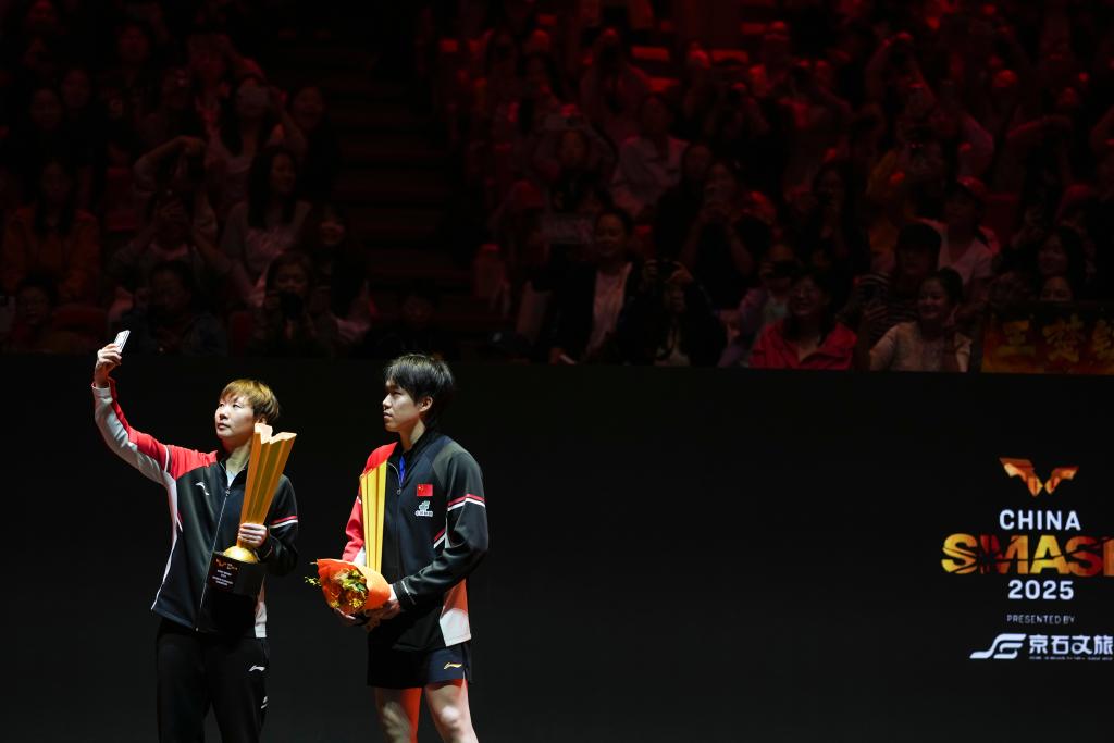 10月5日,男单冠军王楚钦(右)和女单冠军王曼昱在颁奖仪式上合影。新华社记者 孙非 摄