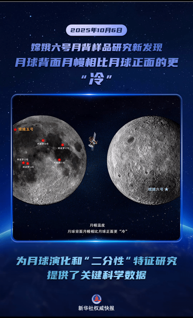 10月6日,时值中秋佳节,国家航天局和国家原子能机构联合发布嫦娥六号月球背面样品研究最新成果。我国科学家首次基于嫦娥六号月球背面样品(月壤)研究发现,月球背面月幔相比月球正面的更“冷”。