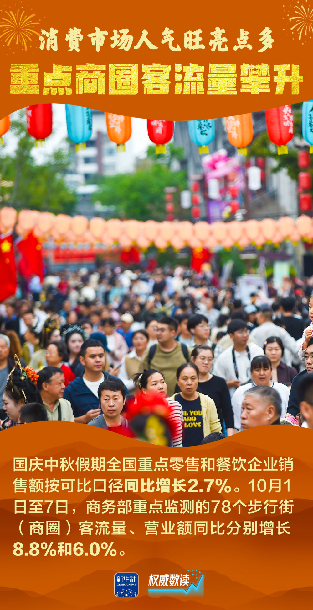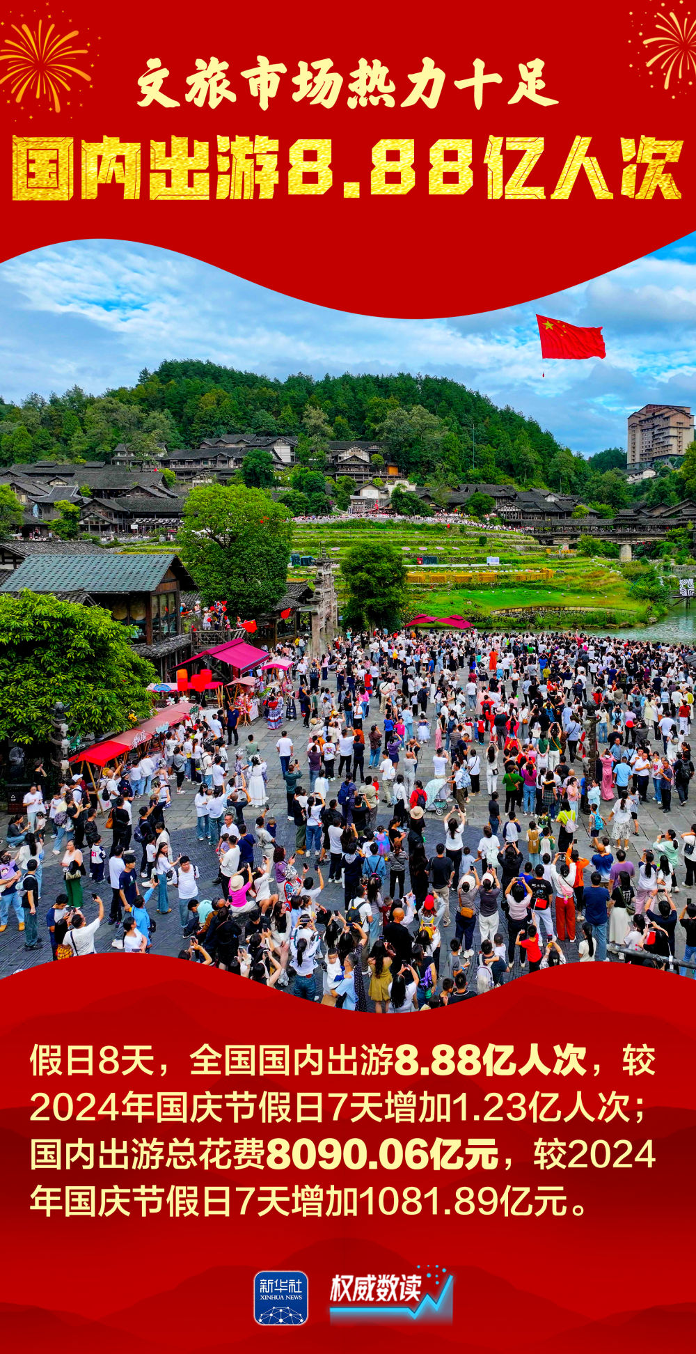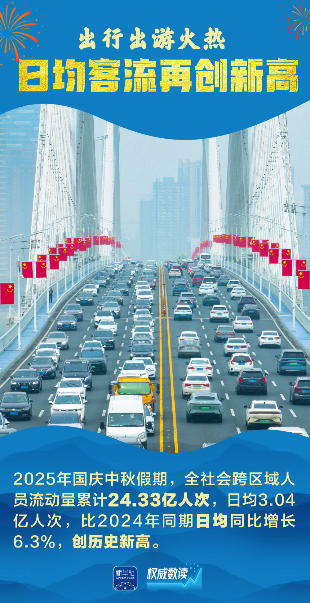 2025年国庆叠加中秋、家国同庆,交通出行、文化旅游、消费市场等都呈现火热场景。每一组跃动的数据,展示经济的奔腾活力;每一个热闹的场景,彰显发展的蓬勃生机。让我们跟随海报,一起感受这个火热奔腾、祥和喜庆的国庆中秋长假。