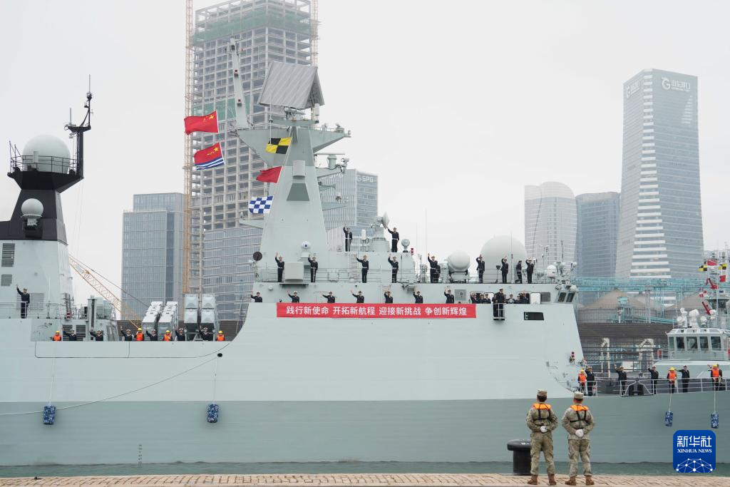 上午9时许,在雄壮的军乐声中,编队舰艇依次解缆,缓缓驶离码头。甲板上,护航官兵精神抖擞,整齐列队,向祖国和亲人挥手告别。