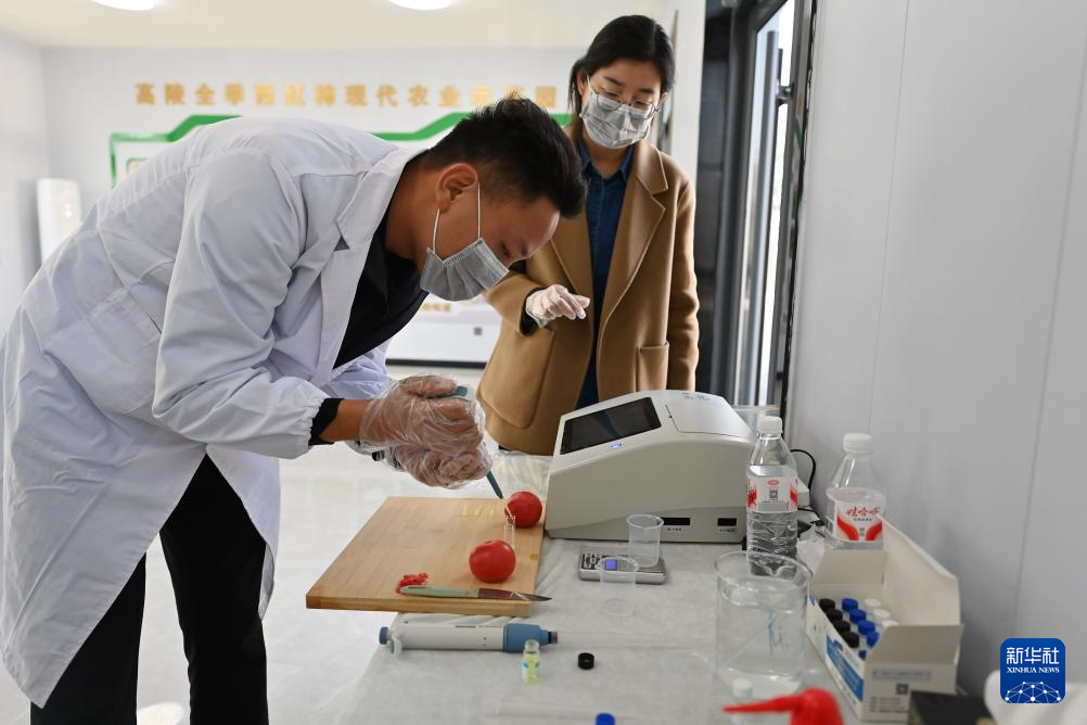 10月27日,在西安高陵全季西红柿示范园(城建园),工作人员在进行农残检测演示。新华社记者 肖潇 摄