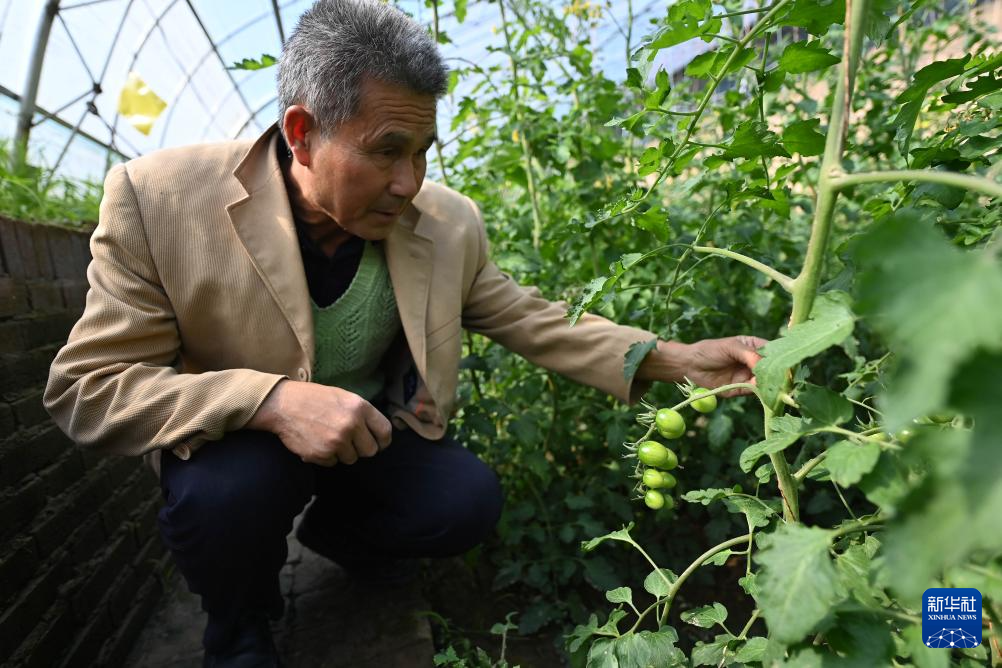 10月27日,农户在高陵区中王农产品专业合作社大棚查看西红柿生长情况。新华社记者 肖潇 摄