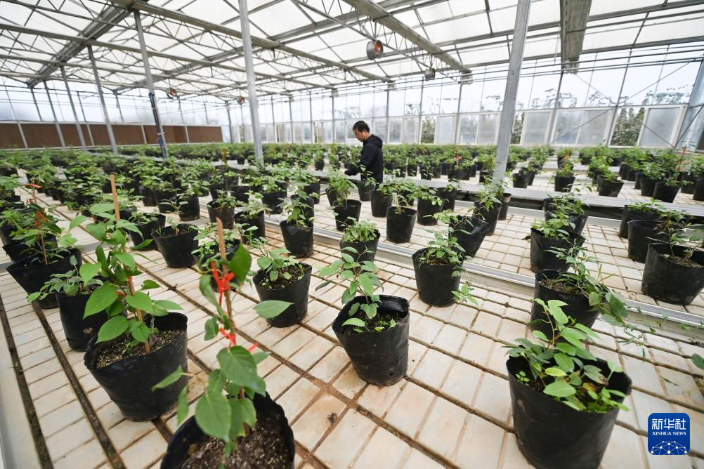 10月29日,在西安市周至县农业科学技术试验站的育苗温室,工作人员在查看猕猴桃砧木试验。新华社记者 肖潇 摄