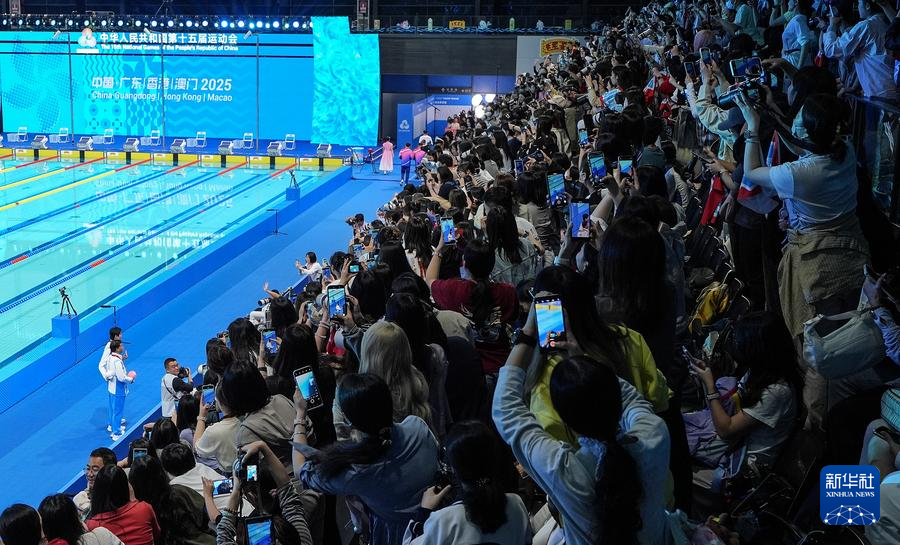 2025年11月10日,冠军浙江队选手汪顺在第十五届全国运动会游泳项目男子4X100米自由泳接力颁奖仪式后向观众致意。新华社记者 丁增尼达 摄