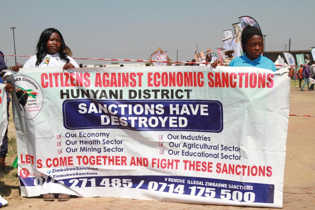 10月25日,在津巴布韦首都哈拉雷举行的“南部非洲发展共同体(南共体)反制裁日”活动上,津巴布韦青年举着反对制裁的海报。新华社发(塔法拉摄)