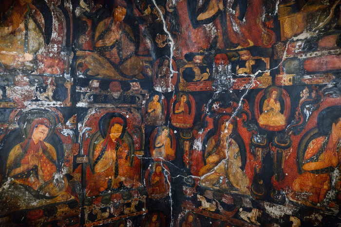 推开山崖上一处石窟的木门,光和风都被隔在外面。洞里一下子静下来,像另一个世界。满壁流光溢彩扑面而来,千年壁画如星河般铺展:人物衣袂翩跹,奇巧的纹样蜿蜒流转。狮子的雄健、孔雀的斑斓、大象的憨拙皆跃然壁间,以天然矿物颜料绘就的色彩历经千年依旧鲜丽。