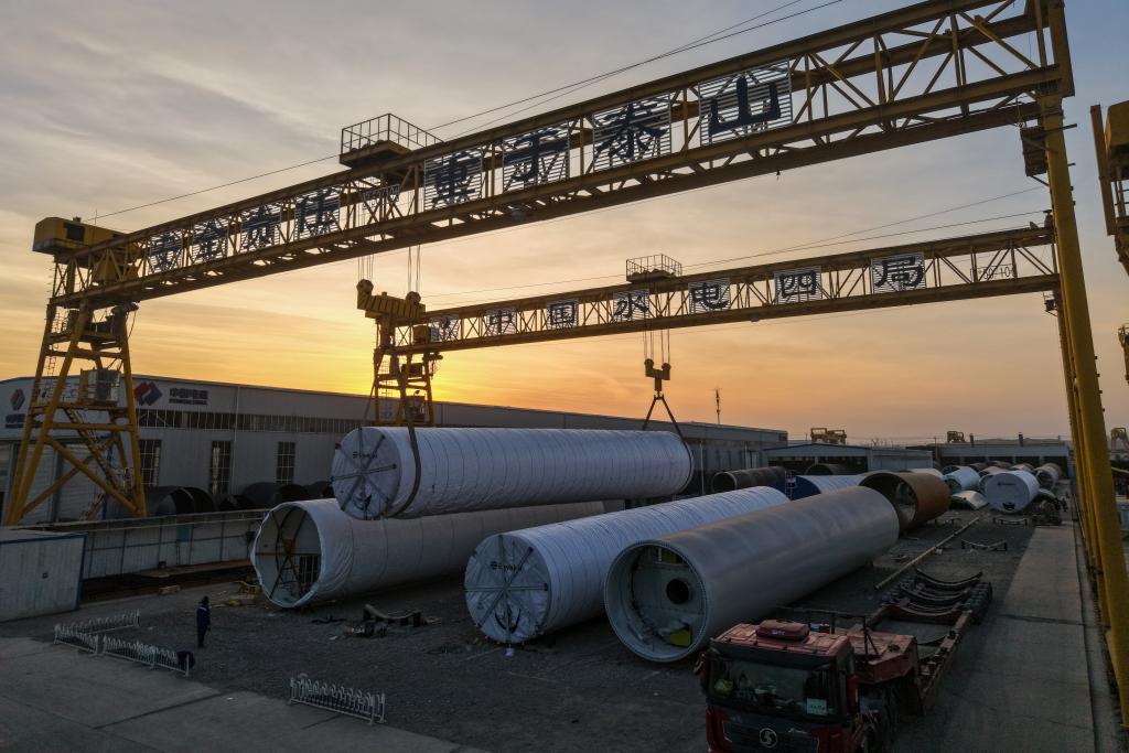 记者在中国水电四局(酒泉)新能源装备有限公司的装运生产线看到,龙门吊正稳稳吊装风电塔筒。现场工作人员介绍,这批塔筒将经霍尔果斯口岸出口,最终运抵乌兹别克斯坦。