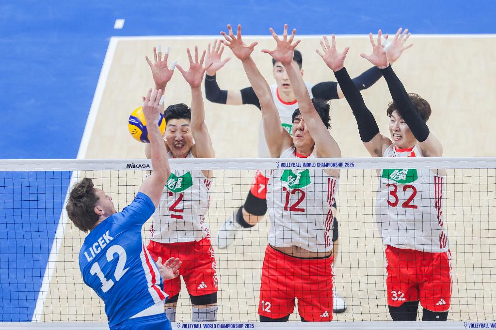 9月18日,中国队球员刘力宾、张哲嘉、江川(从右至左,前)在2025年世界男排锦标赛小组赛比赛中防守。新华社发(乌马利摄)