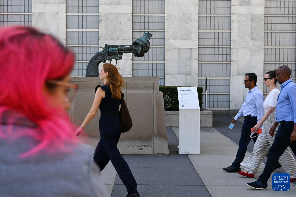 9月18日,在位于纽约的联合国总部,人们从“打结的手枪”雕塑前走过。新华社记者 李睿 摄