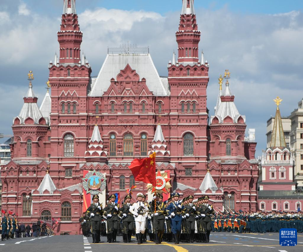 5月9日,在俄罗斯首都莫斯科,中国人民解放军仪仗司礼大队方队参加纪念苏联伟大卫国战争胜利80周年阅兵式。新华社记者 赖向东 摄