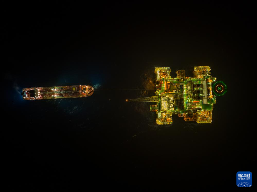 “深海一号”能源站在夜间开展凝析油外输作业(资料照片)。新华社发(中国海油供图)