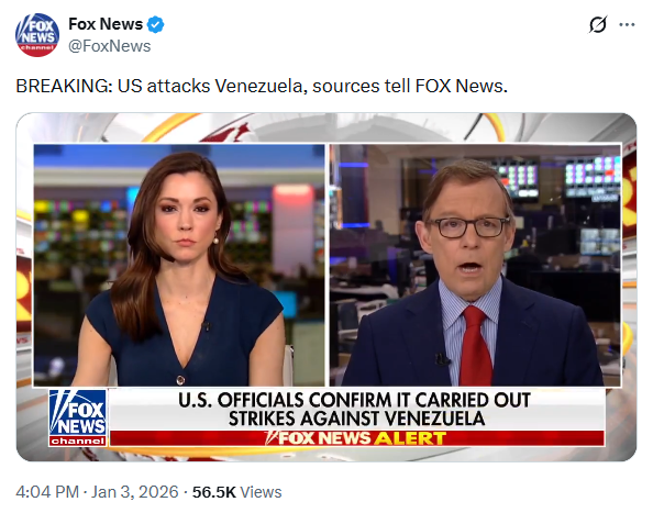 美国福克斯新闻1月3日报道,美军官员证实,美军对委内瑞拉的打击“正在进行中”。