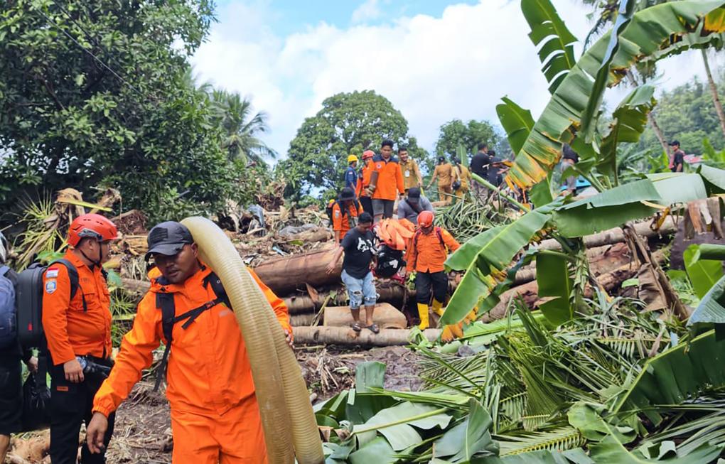 1月6日,在印度尼西亚北苏拉威西省,救援人员运送救援设备。