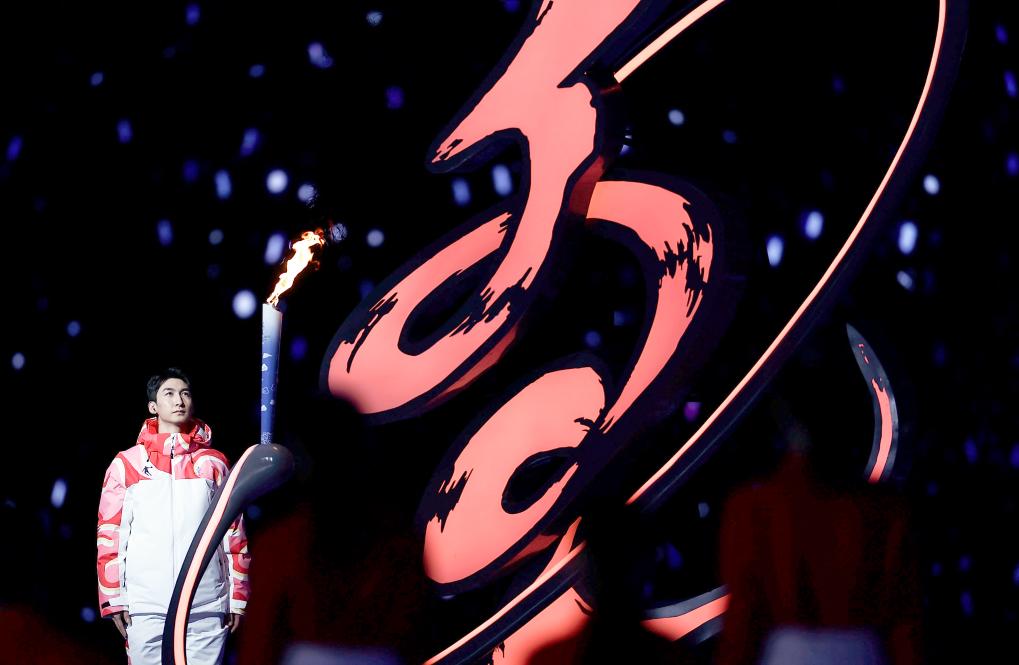 这是2024年2月17日,火炬手武大靖在第十四届全国冬季运动会开幕式上点燃主火炬。新华社记者 黄伟 摄