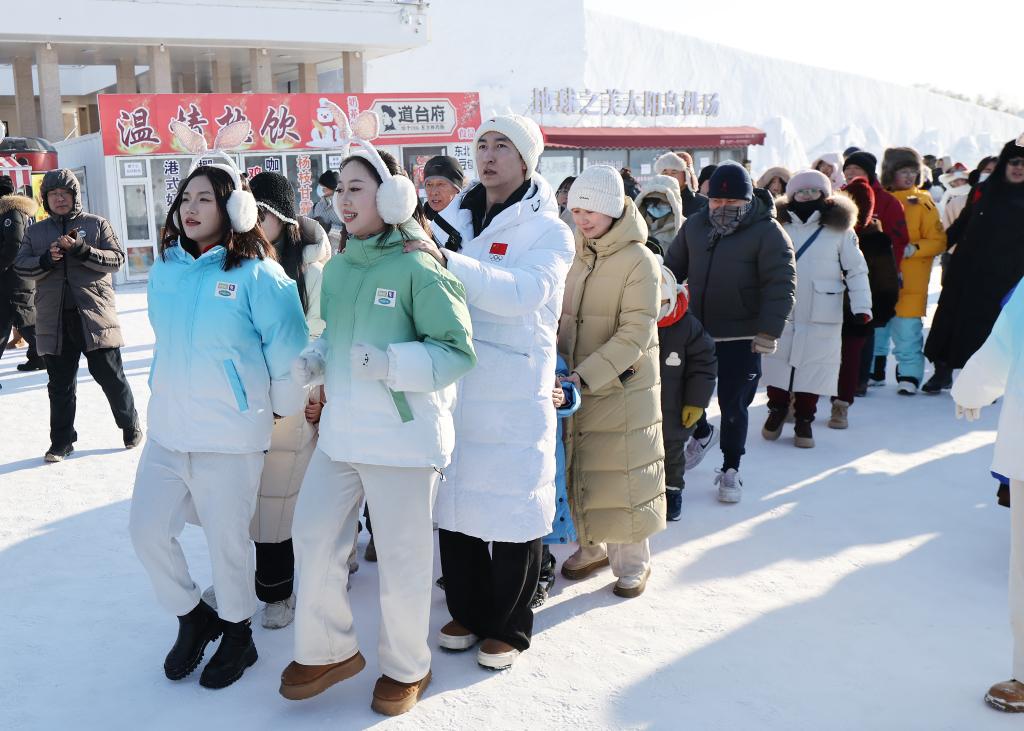 这是2025年2月9日,冬奥冠军武大靖(前左三)在哈尔滨太阳岛雪博会上和游客一起跳雪地兔子舞。新华社记者 侯俊 摄