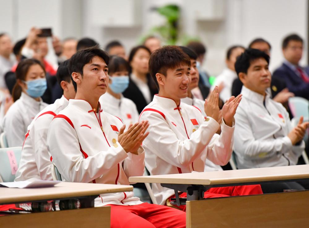 这是2022年11月2日,武大靖在北京延庆举行的国家集训队交流活动中发言。新华社记者 胡星宇 摄