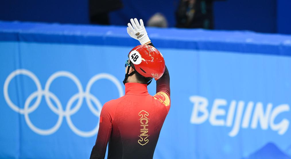 这是2022年2月13日,中国选手武大靖在北京2022年冬奥会短道速滑项目男子500米决赛后向现场观众挥手。新华社记者 黄宗治 摄