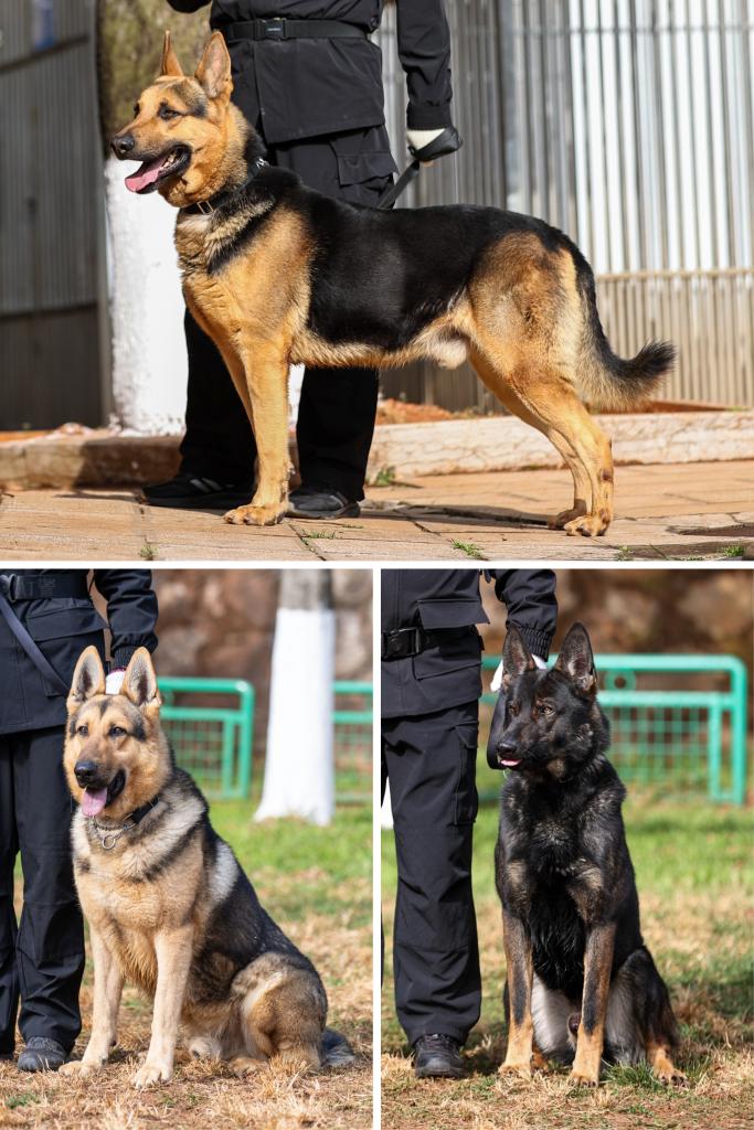 拼版照片:上图为1月5日在公安部昆明警犬基地拍摄的一只黑背品系昆明犬;左下图为1月5日在公安部昆明警犬基地拍摄的一只草黄品系昆明犬;右下图为1月5日在公安部昆明警犬基地拍摄的一只狼青品系昆明犬。