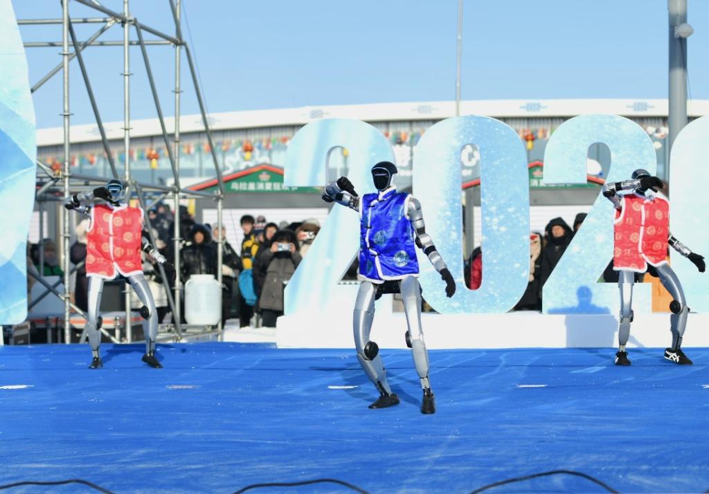 上午10时,民族特色歌舞表演拉开开幕式序幕,演员们踩着雪地载歌载舞,游客观众驻足围观、拍手叫好。开幕式上,智能机器人成为亮点,时而摆造型时而与观众互动,科技感拉满,还举行了《野狼谷》电影开机仪式。