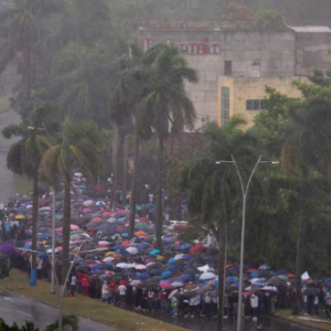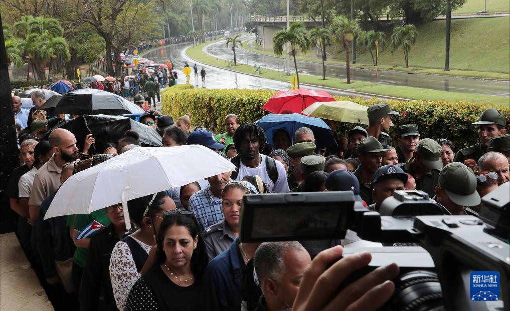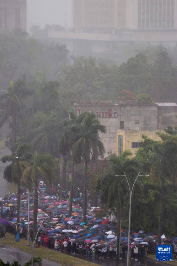 冷锋过境,暴雨突至。古巴首都哈瓦那15日早晨原本晴朗的天空骤然阴沉,大雨倾盆而下。在古巴革命武装力量部总部大楼外,数万古巴民众在风雨中肃立,默默排着长队,等待向在美国袭击委内瑞拉事件中牺牲的32名古巴人员致哀。