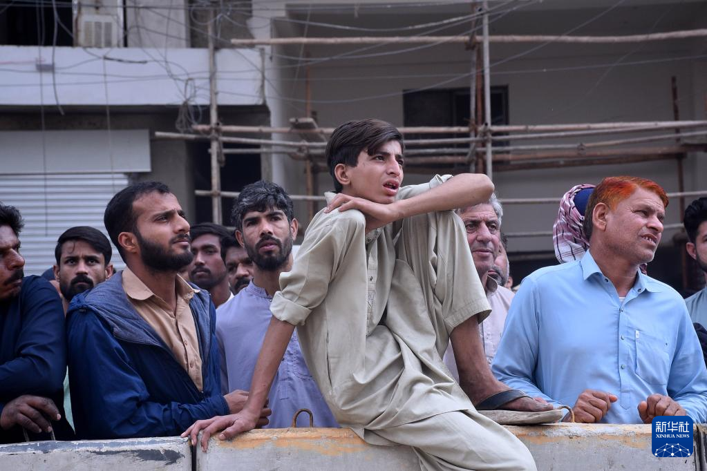 1月19日,在巴基斯坦卡拉奇,人们在火灾现场附近关注救援行动。新华社发