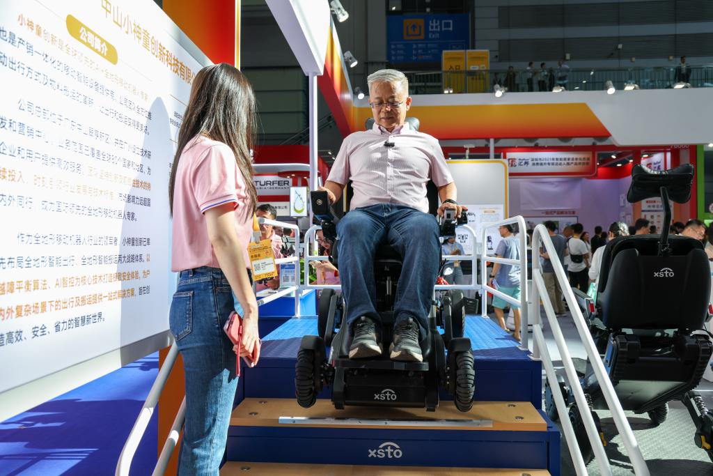 2025年9月12日,2025深圳国际智慧养老产业博览会在深圳会展中心(福田)开幕,观众在展会现场体验一款可以上下楼梯的智能出行机器人。新华社记者梁旭摄