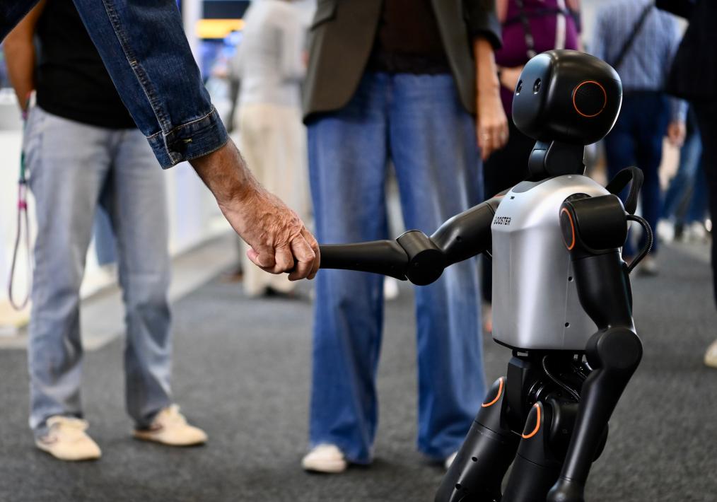 2025年9月5日,一名观众在德国柏林国际消费电子展上与人形机器人握手。新华社记者张豪夫摄