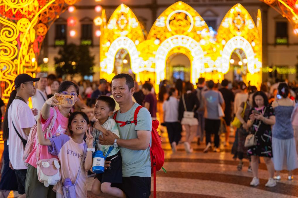 2025年10月6日,游客在澳门议事亭前地游览、拍照。新华社发(张金加摄)