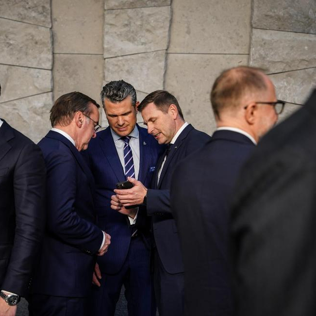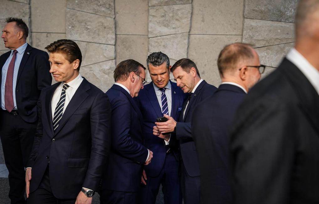 2025年10月15日,在比利时布鲁塞尔举行的北约防长会议结束后,美国国防部长赫格塞思(中)与爱沙尼亚国防部长佩夫库尔(右三)、德国国防部长皮斯托里乌斯(左三)交谈。新华社记者彭子洋摄
