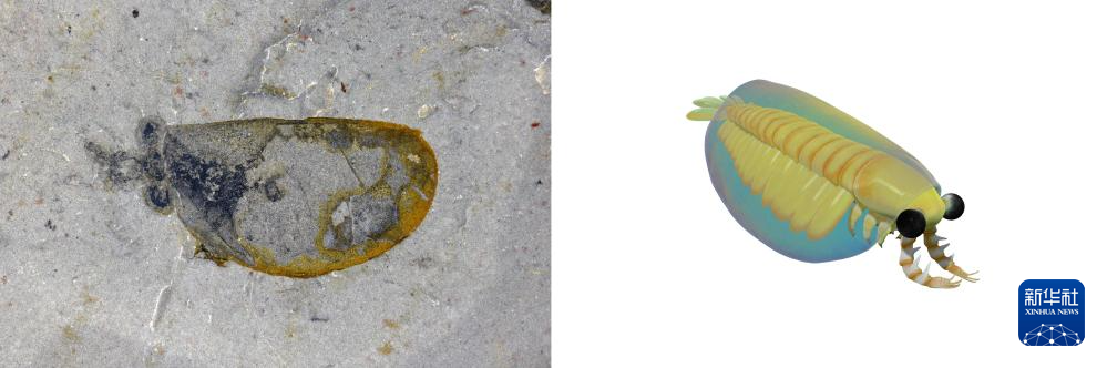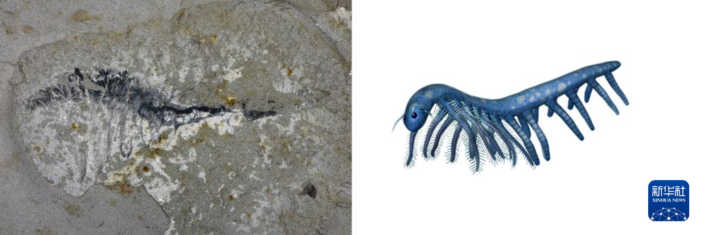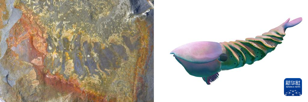 花垣生物群射齿类节肢动物-赫德虾类化石图(左)和复原图。新华社发