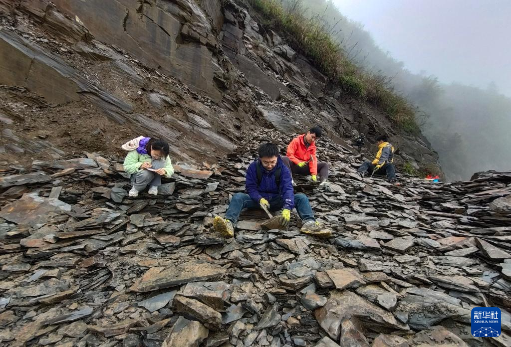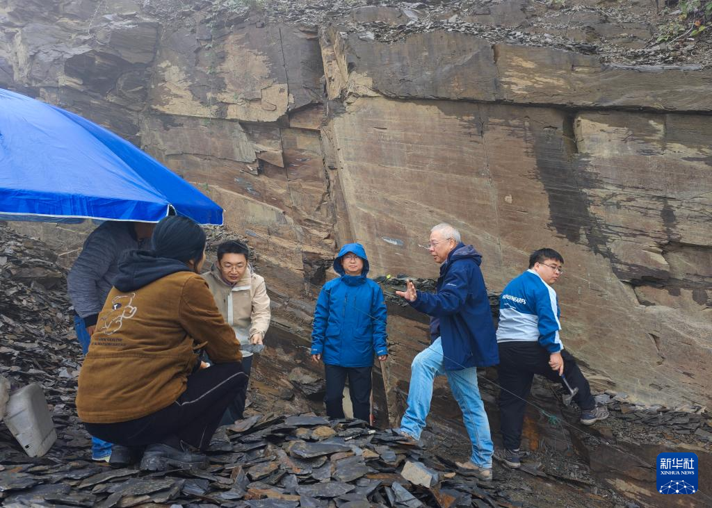 中国科学院院士、研究员朱茂炎(右二)带领野外团队在湖南省湘西土家族苗族自治州花垣县石栏镇磨子村考察化石采坑(2024年11月18日摄)。新华社发