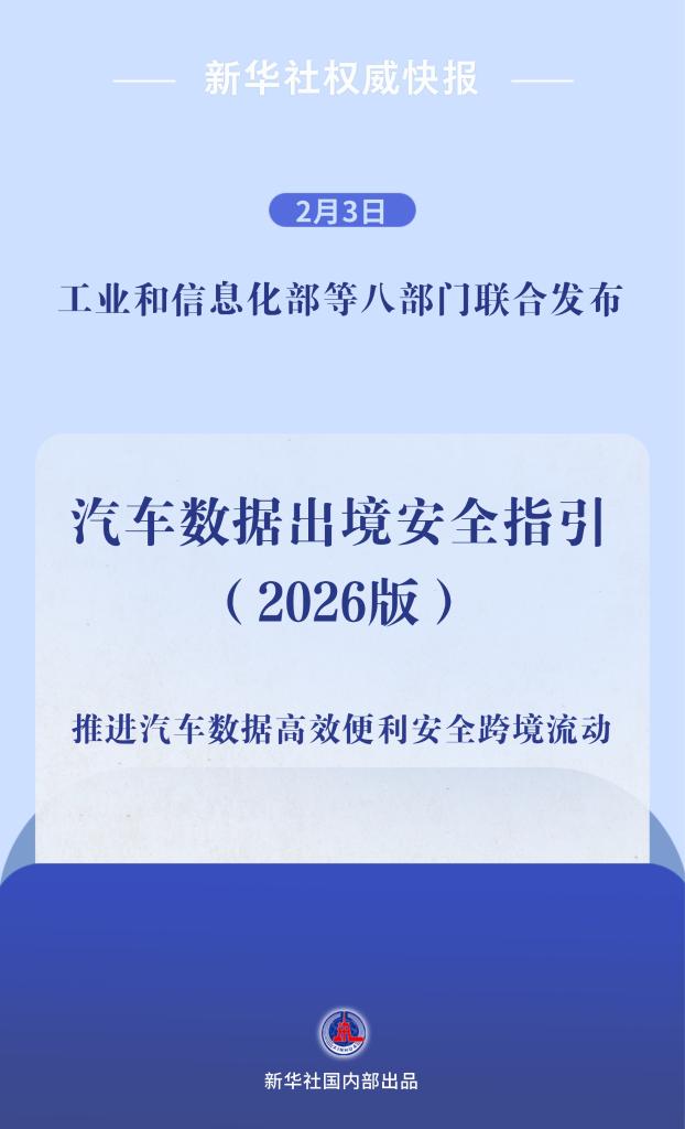 新华社北京2月3日电(记者唐诗凝)工业和信息化部等八部门3日联合发布《汽车数据出境安全指引(2026版)》,明确汽车数据出境活动管理方式、重要数据判定规则和安全保护要求,旨在推动建立高效便利安全的汽车数据跨境流动机制,提升汽车数据出境便利化水平。