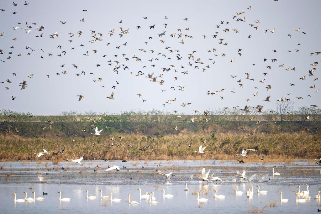候鸟在上海崇明东滩鸟类国家级自然保护区栖息(1月23日摄)。