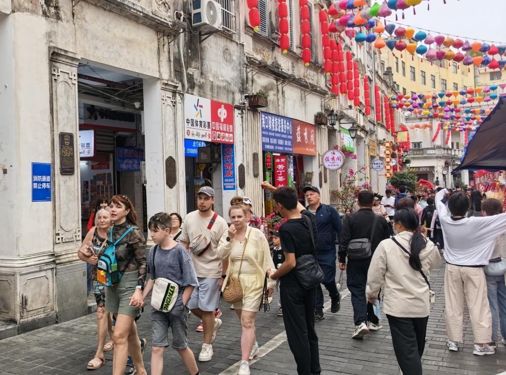 2026年2月5日,外籍游客在海口骑楼老街游玩。新华社记者刘邓 摄