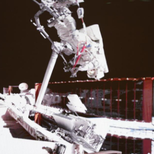 这是2025年5月22日在北京航天飞行控制中心屏幕上拍摄的神舟二十号航天员陈冬在空间站组合体舱外工作的画面。新华社记者 厉彦辰 摄